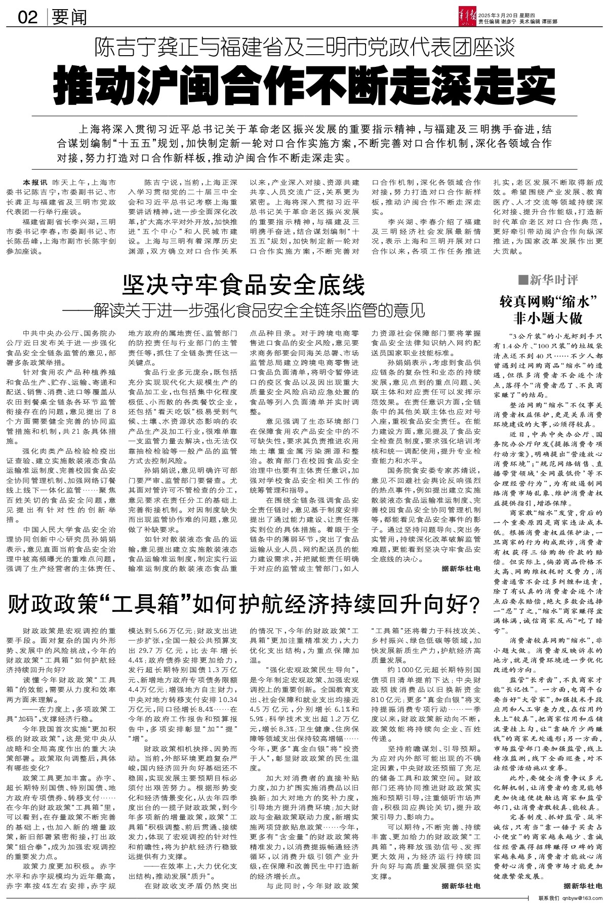 陈吉宁说,当前,上海正深入学习贯彻党的二十届三中全会和习近平总书记考察上海重要讲话精神,进一步全面深化改革,扩大高水平对外开放,加快推进“五个中心”和人民城市建设。上海与三明有着深厚历史渊源,双方确立对口合作关系以来,产业深入对接、资源共建共享、人员交流广泛,关系更为紧密。上海将深入贯彻习近平总书记关于革命老区振兴发展的重要指示精神,与福建及三明携手奋进,结合谋划编制“十五五”规划,加快制定新一轮对口合作实施方案,不断完善对口合作机制,深化各领域合作对接,努力打造对口合作新样板,推动沪闽合作不断走深走实。