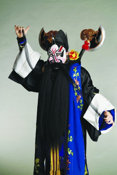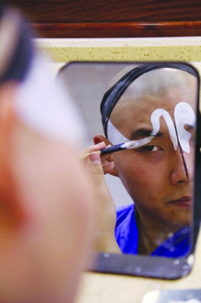 这当然是为了唱戏。“我们唱花脸的,位置都得画到这儿。”他指着额头上方一块,耐心地讲解,那儿头发剃得很干净,“因为这样显得脸更大。角色更加立体、形象更加突出。再说我们得在头上戴盔头,头发不剃掉就容易打滑。”