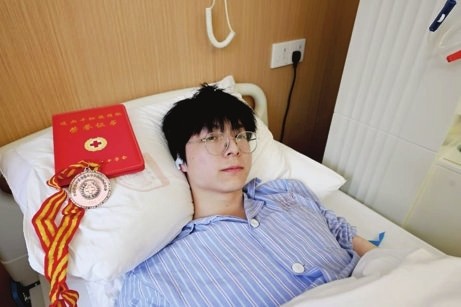 3月25日上午,华山医院2号楼的5楼,出生于2004年的陈焕东安静地躺在病床上。身旁的机器有条不紊地运转着。通过血细胞分离机,造血干细胞混悬液被采集出来,其余血液成分又缓缓回输进陈焕东的身体。捐献当天,他的初中好友也特意从武汉赶来,为他加油!