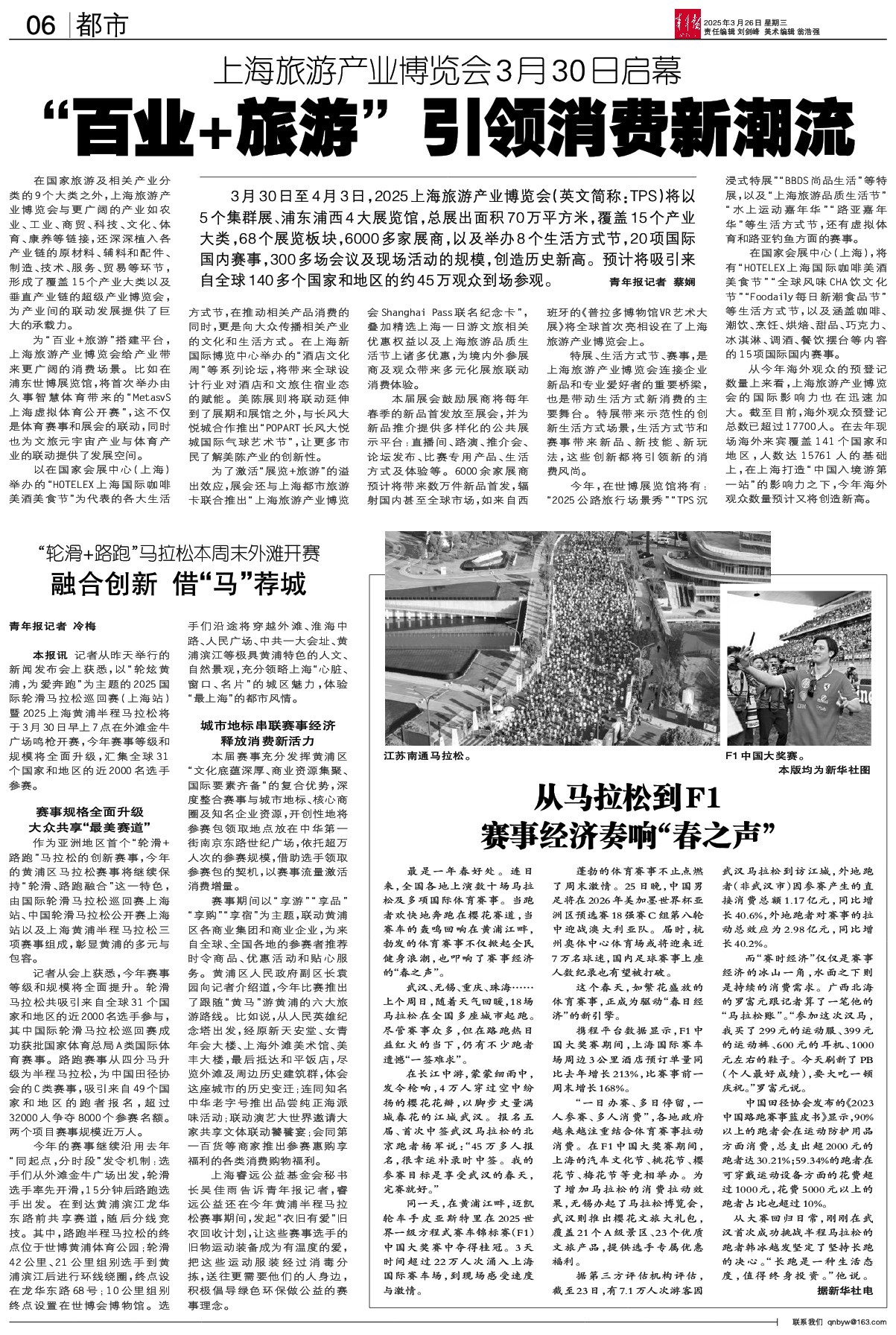 同一天,在黄浦江畔,迈凯轮车手皮亚斯特里在2025世界一级方程式赛车锦标赛(F1)中国大奖赛中夺得桂冠。3天时间超过22万人次涌入上海国际赛车场,到现场感受速度与激情。