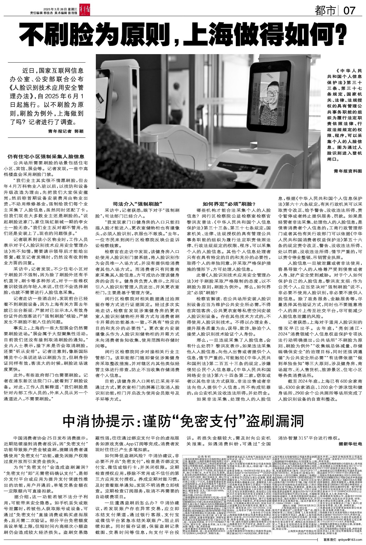 近日,国家互联网信息办公室、公安部联合公布《人脸识别技术应用安全管理办法》,自2025年6月1日起施行。以不刷脸为原则,刷脸为例外,上海做到了吗?记者进行了调查。
