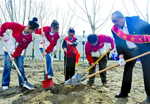 在哈密市凤凰台大营,“哈密好人”代表、少先队员代表和西部计划大学生志愿者代表在种植“左公柳”。 新华社 图