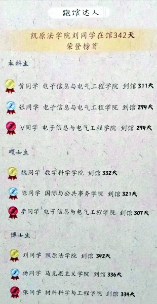 2024年,上海交通大学全校人均入馆24天。2024年国家奖学金获得者的人均入馆天数超出平均数字,达到37天。特别值得关注的是,本科获奖者人均入馆64天,其中一位同学更是以307天的入馆纪录荣登“跑馆达人”。而凯原法学院刘同学342天的在馆足迹,让他的身影深深印刻在图书馆智能门禁系统的记忆中。