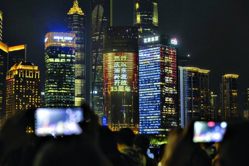 人们在外滩拍摄对岸陆家嘴庆祝浦东开发开放35周年光影秀。新华社 图