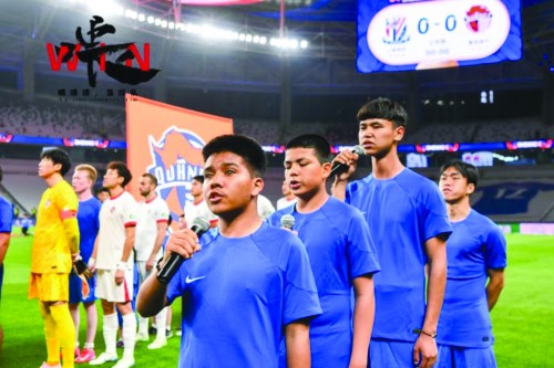 16日晚,上海申花主场对阵青岛海牛,在赛前仪式上,来自新疆的盲人足球小队员踏入赛场,并作为领唱人员高唱国歌。