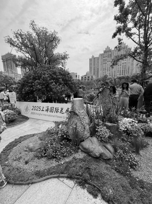 漫步在新天地主会场,市民游客穿梭其中,拍照打卡。驻足观赏鲜花的一位游客称赞道:“今年设计很有新意,花和一大会址、湖水融为一体,花色特别好看。”另一位摄影爱好者则对花展布局赞不绝口:“环湖布置不压抑,和太平湖、中共一大会址厚重建筑相互映衬,有主有次,特别融洽。”在中共一大纪念馆室外区域,20件海派非遗盆景作品引得参观者频频驻足,为庄严氛围增添了一抹雅致。