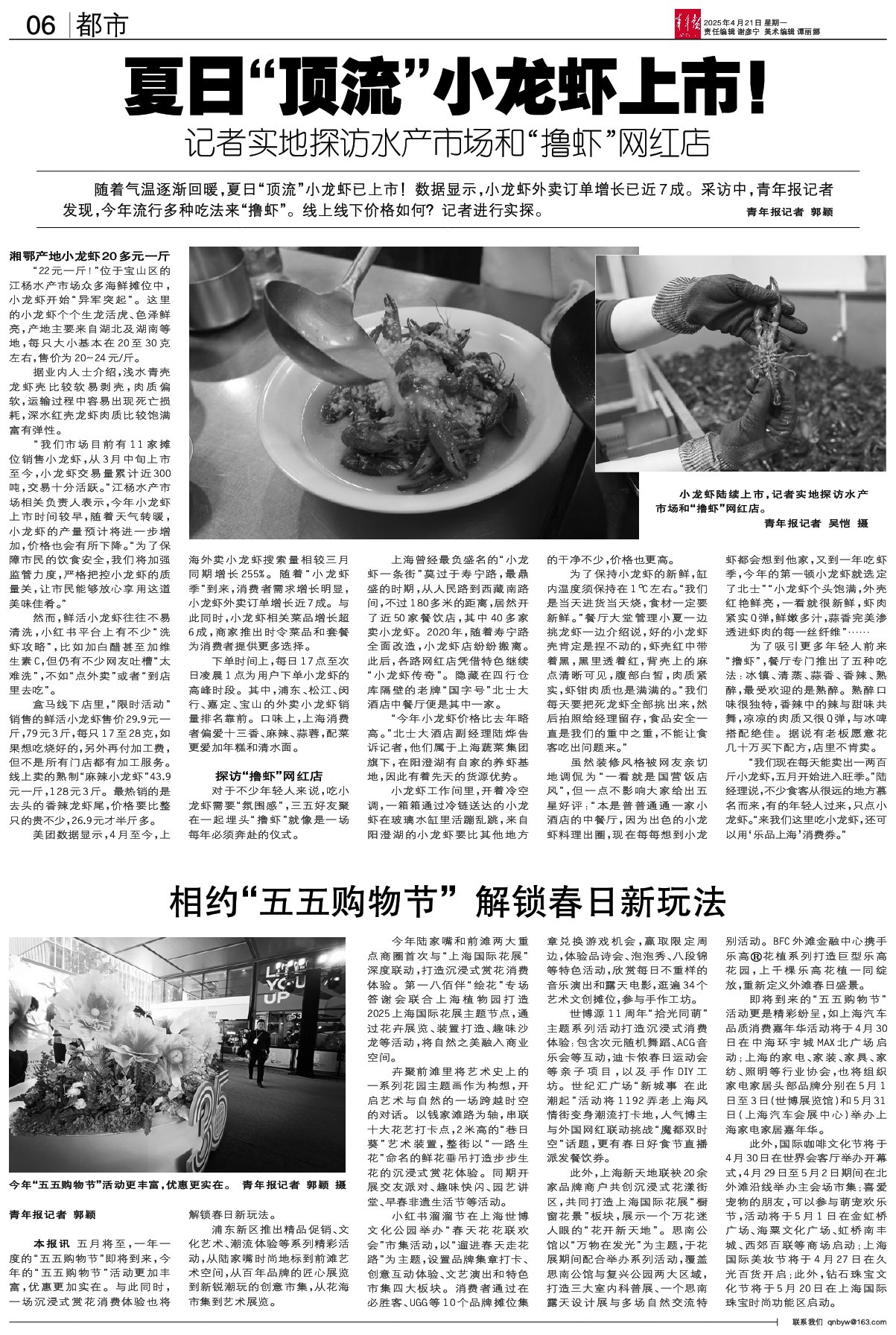 此外,国际咖啡文化节将于4月30日在世界会客厅举办开幕式,4月29日至5月2日期间在北外滩沿线举办主会场市集;喜爱宠物的朋友,可以参与萌宠欢乐节,活动将于5月1日在金虹桥广场、海粟文化广场、虹桥南丰城、西郊百联等商场启动;上海国际美妆节将于4月27日在久光百货开启;此外,钻石珠宝文化节将于5月20日在上海国际珠宝时尚功能区启动。