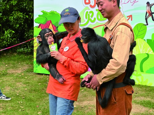 饲养员带着黑猩猩叮叮、蜘蛛猴豆豆与观众互动。青年报记者 吴恺 摄