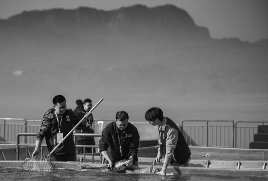 湖北省宜昌市长江珍稀鱼类放流点开展中华鲟保护宣传和增殖放流活动。这是工作人员将中华鲟捞至放流箱内(2024年3月28日摄)。本版均为新华社图