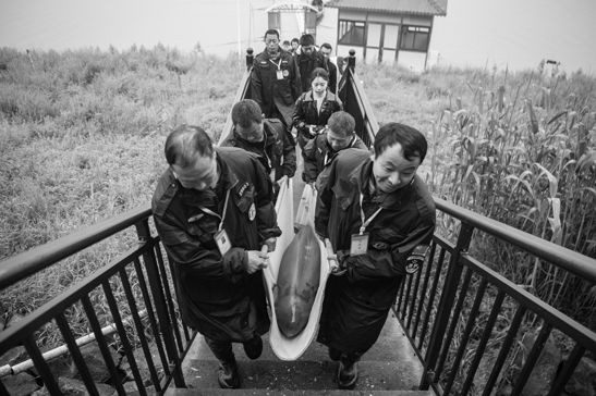 工作人员转运即将放归的长江江豚(2023年4月25日摄)。当日,来自长江天鹅洲故道的4头迁地保护长江江豚分批顺利放归进入长江干流新螺和石首江段。