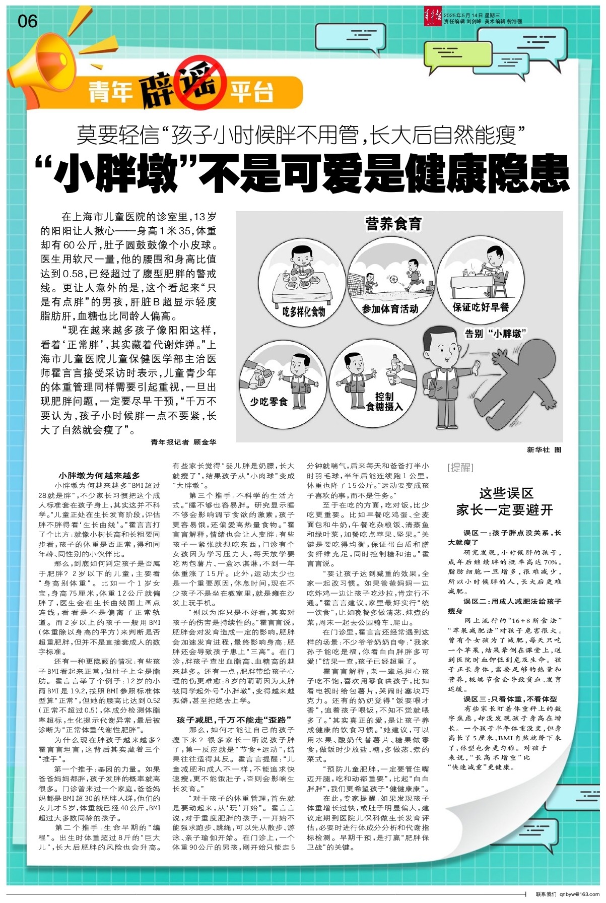 “现在越来越多孩子像阳阳这样,看着‘正常胖’,其实藏着代谢炸弹。”上海市儿童医院儿童保健医学部主治医师霍言言接受采访时表示,儿童青少年的体重管理同样需要引起重视,一旦出现肥胖问题,一定要尽早干预,“千万不要认为,孩子小时候胖一点不要紧,长大了自然就会瘦了”。