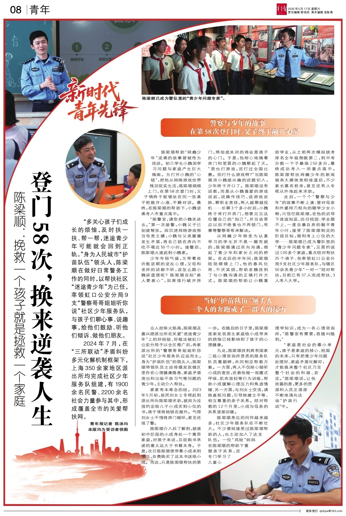 此后,一个个“警察与少年”的故事不断上演:曾对母亲和外婆持刀相向的辍学少女小韩,只信任陈梁顺,在他的劝导下迷途知返、回归校园;学业跟不上、一度自暴自弃的躺平青年小叶,接受了陈梁顺制定的阶段目标,顺利考上心仪的大学……陈梁顺已成为警队里的“青少年问题专家”,见面约谈过100多个家庭,重点结对帮扶25个孩子;他率领虹口公安分局9支社区少年服务队,与辖区50余名青少年“一对一”结对帮扶,目前已有37人完成帮扶、3人考入大学。
