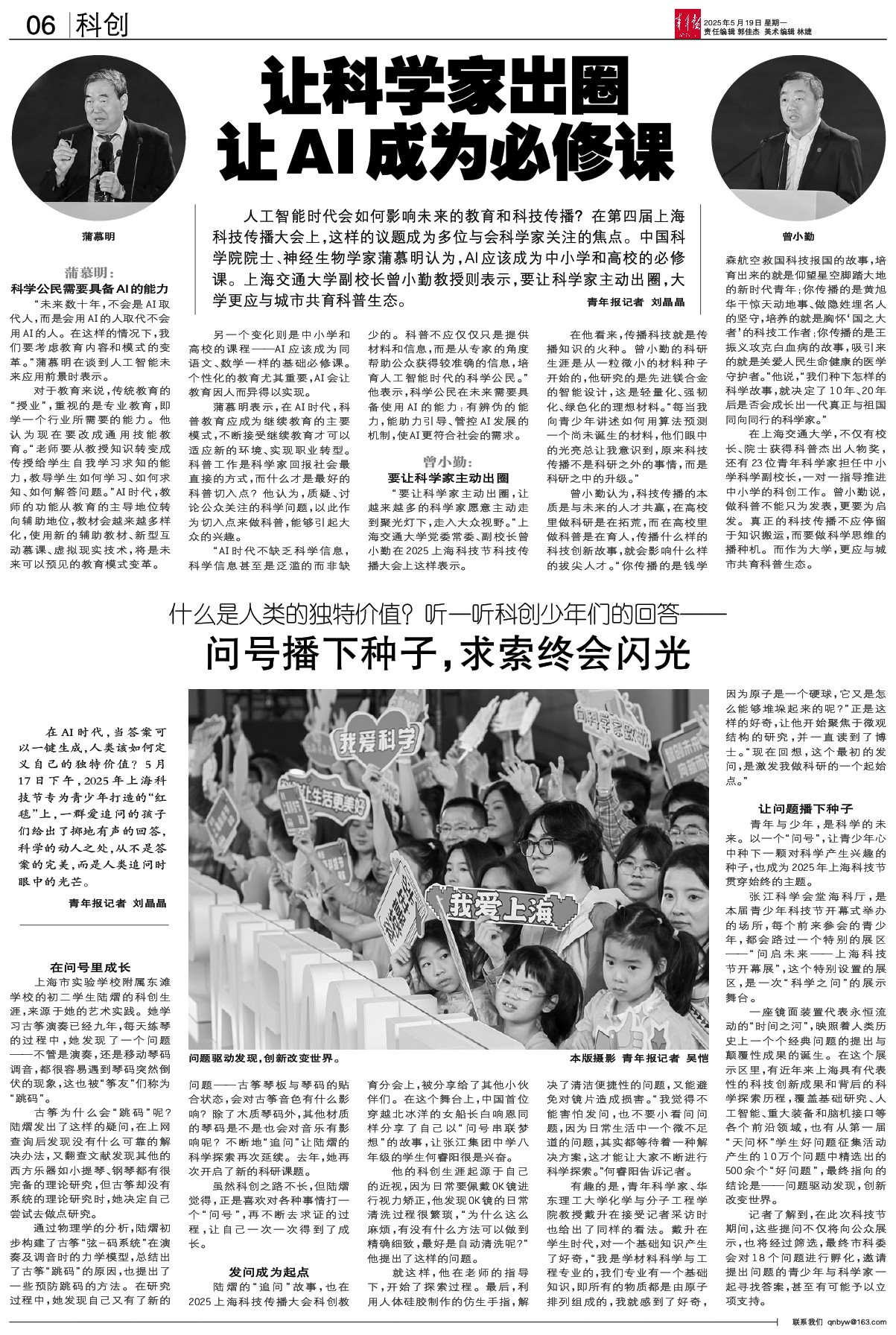在上海交通大学,不仅有校长、院士获得科普杰出人物奖,还有23位青年科学家担任中小学科学副校长,一对一指导推进中小学的科创工作。曾小勤说,做科普不能只为发表,更要为启发。真正的科技传播不应停留于知识搬运,而要做科学思维的播种机。而作为大学,更应与城市共育科普生态。