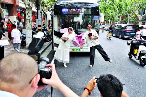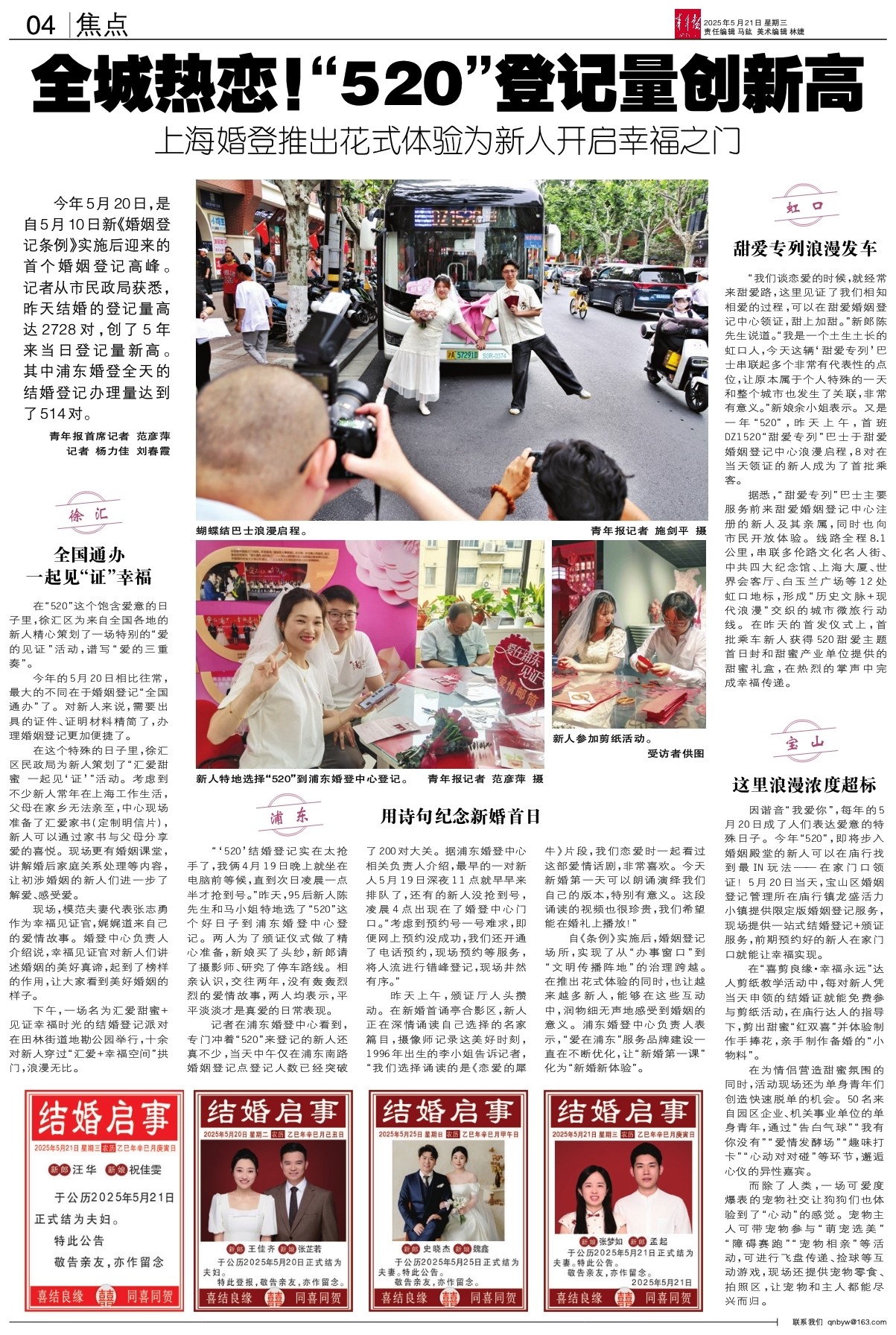 “我们谈恋爱的时候,就经常来甜爱路,这里见证了我们相知相爱的过程,可以在甜爱婚姻登记中心领证,甜上加甜。”新郎陈先生说道。“我是一个土生土长的虹口人,今天这辆‘甜爱专列’巴士串联起多个非常有代表性的点位,让原本属于个人特殊的一天和整个城市也发生了关联,非常有意义。”新娘余小姐表示。又是一年“520”,昨天上午,首班DZ1520“甜爱专列”巴士于甜爱婚姻登记中心浪漫启程,8对在当天领证的新人成为了首批乘客。