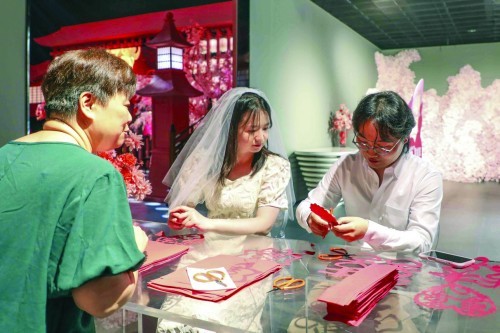 在“喜剪良缘·幸福永远”达人剪纸教学活动中,每对新人凭当天申领的结婚证就能免费参与剪纸活动,在庙行达人的指导下,剪出甜蜜“红双喜”并体验制作手捧花,亲手制作备婚的“小物料”。