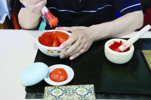 符海贤很小的时候就看父亲符骥良用研钵研磨朱砂,这是一件相当耗时耗力的事情,每磨一个小时,就在纸上给“正”字添上一笔,1斤朱砂研磨下来要写100个“正”字,也就是500个小时。那朱砂粉的目数怎么才叫“到位”了呢?符骥良告诉儿子,如将这朱砂粉放在桌上,人走过,粉末可以扬起,而若进入眼睛,人也不会感到难受。就是要到这么一个细腻的程度。
