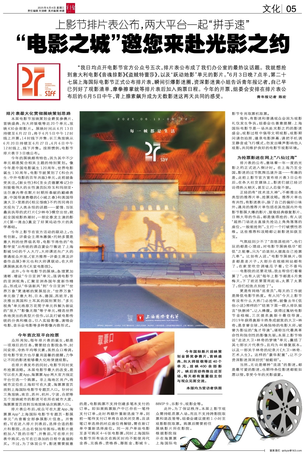“我日均点开电影节官方公众号五次,排片表公布成了我们办公室的最热议话题。我就想抢到意大利电影《音魂掠影》《盗贼特蕾莎》,以及‘跃动她影’单元的影片。”6月3日晚7点半,第二十七届上海国际电影节正式公布排片表,瞬间引爆影迷圈,资深影迷黄小姐告诉青年报记者,自己早已列好了观影清单,摩拳擦掌就等排片表后加入购票日程。今年的开票,组委会安排在排片表公布后的6月5日中午,肾上腺素飙升成为无数影迷这两天共同的感受。