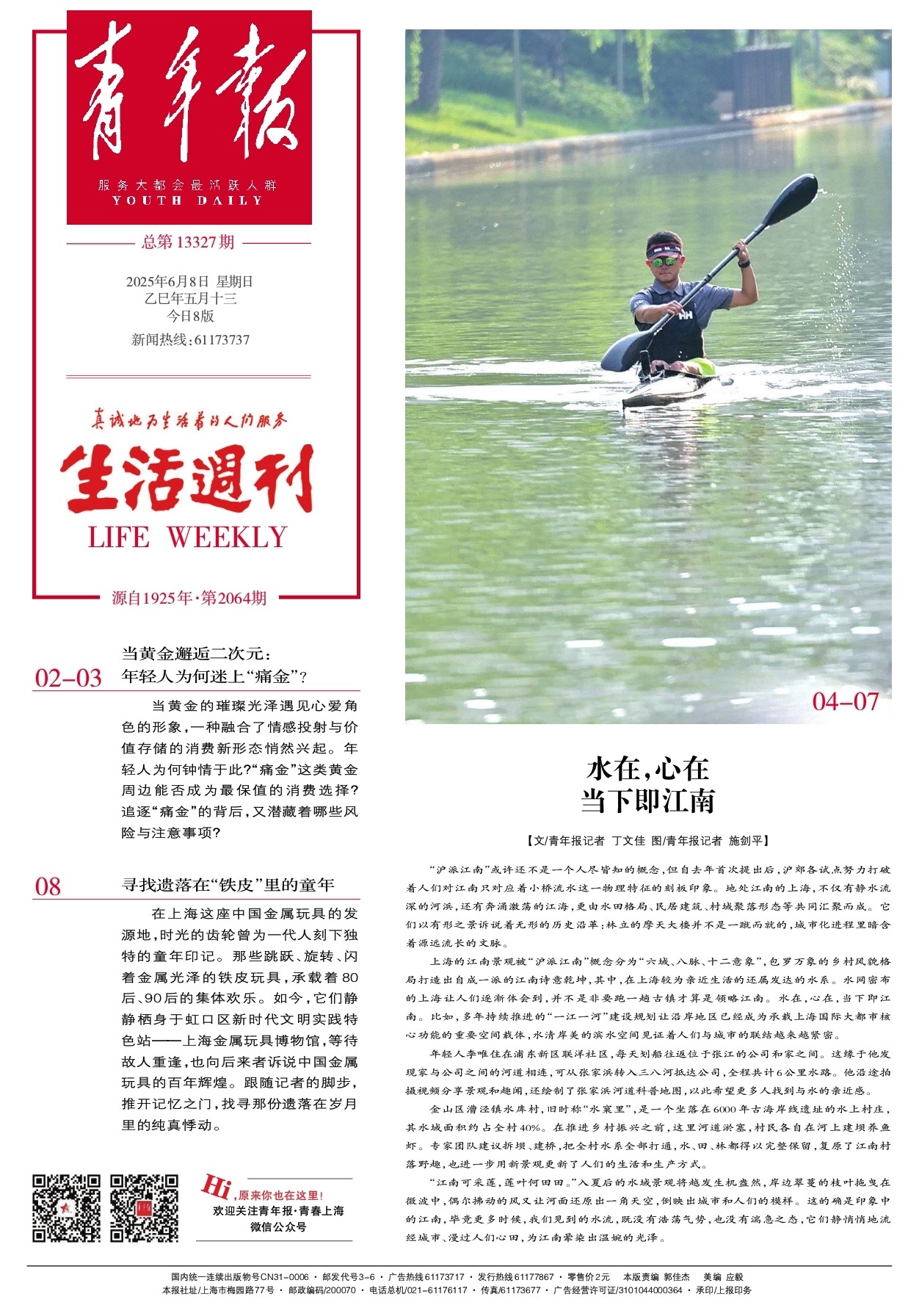 年轻人李唯住在浦东新区联洋社区,每天划船往返位于张江的公司和家之间。这缘于他发现家与公司之间的河道相连,可从张家浜转入三八河抵达公司,全程共计6公里水路。他沿途拍摄视频分享景观和趣闻,还绘制了张家浜河道科普地图,以此希望更多人找到与水的亲近感。