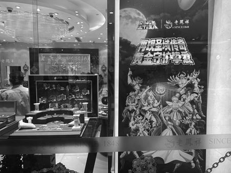 记者走访环球港及豫园商圈多家金店发现,不同品牌各有所好,联名款多以转运珠与吊坠为主,采用硬金工艺打造,中心常作镂空处理。周大福与迪士尼的合作,带来了史迪奇、三眼仔、草莓熊、米奇、维尼熊等卡通形象的黄金小件,标价多在2000元左右。周生生则与三丽鸥、迪士尼合作,Hello Kitty(凯蒂猫)与白雪公主的足金转运珠,价格区间在2500元至3000元。老牌金店老凤祥,则将目光投向《圣斗士星矢》《机动战士高达》与《星穹铁道》,推出黄金圣衣转运珠、挂坠、金片乃至黄金手办。一套12件的黄金圣衣转运珠与挂坠,单价(含工费)分别为3999元与3580元,而一件重达88克的黄金手办,标价更是高达11万元。