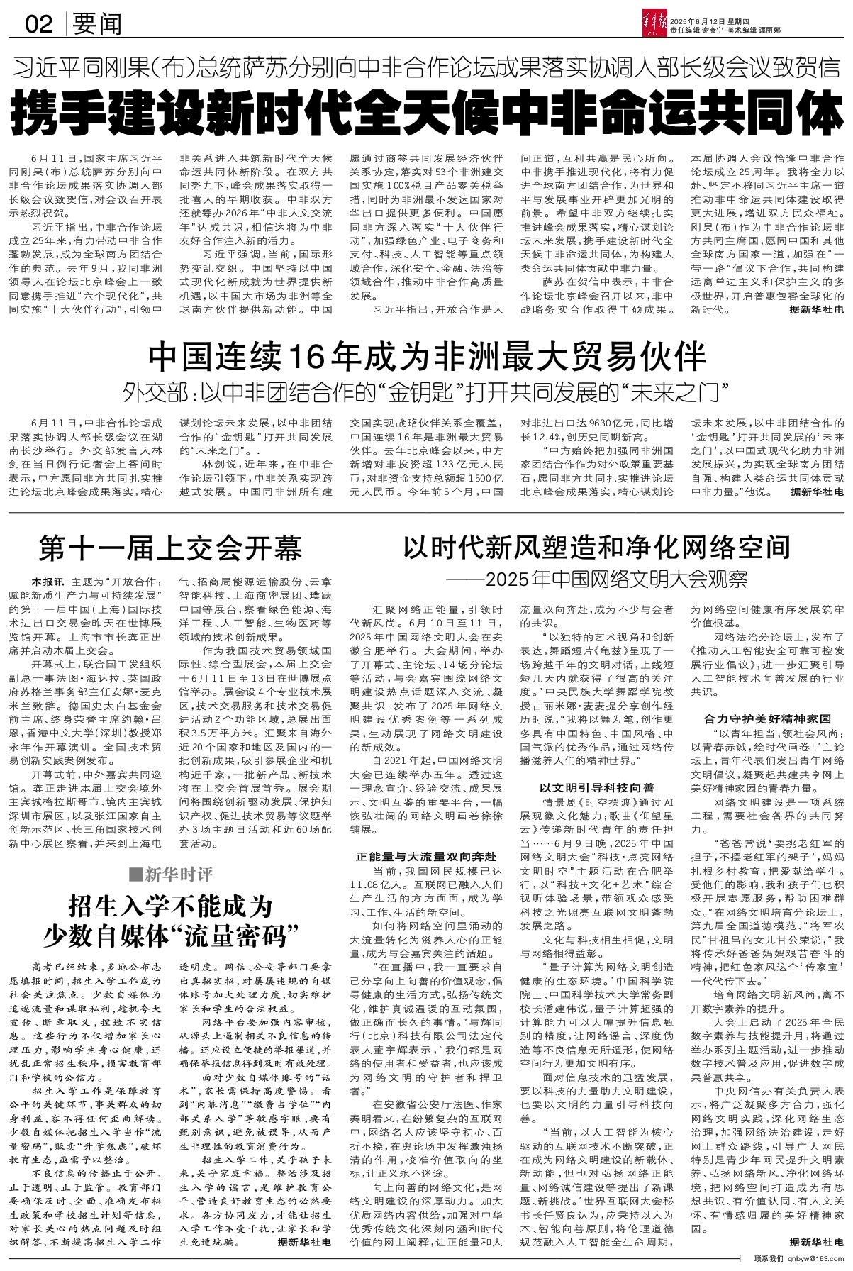 习近平指出,中非合作论坛成立25年来,有力带动中非合作蓬勃发展,成为全球南方团结合作的典范。去年9月,我同非洲领导人在论坛北京峰会上一致同意携手推进“六个现代化”,共同实施“十大伙伴行动”,引领中非关系进入共筑新时代全天候命运共同体新阶段。在双方共同努力下,峰会成果落实取得一批喜人的早期收获。中非双方还就筹办2026年“中非人文交流年”达成共识,相信这将为中非友好合作注入新的活力。
