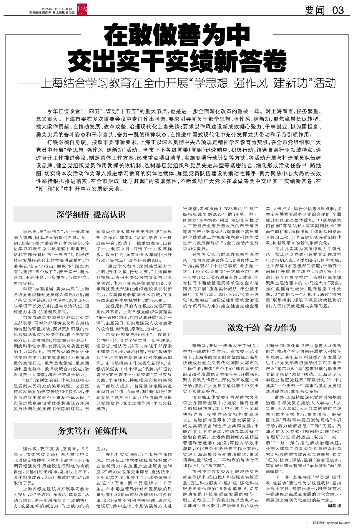 牢记“为国担当、勇为尖兵”,上海各级党组织推动党员深入学思践悟,健全落实以学铸魂、以学增智、以学正风、以学促干长效机制,提高政治站位、锤炼能力本领、弘扬新风正气。