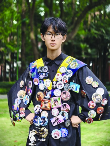 电路与绘笔,编写代码与服装设计,来自上海理工大学机械设计制造及自动化专业的毕业生曹金龙用63枚动漫徽章装点毕业学士服,并将毕业照发布在他的小红书账号“青柳cc”,收获2.3万点赞和近3000条评论。