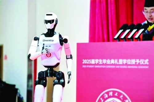 本报讯 上海理工大学6月16日举行2025届学生毕业典礼暨学位授予仪式,刚赢下人形机器人马拉松的“行者二号”成为台上最靓的“崽”,为毕业生送上祝福。与此同时,自去年簪花学士服火了之后,今年这一届毕业生又开发出了新的“谷子学士服”,用动漫周边“谷子”装饰学士服,DIY成“痛衣”。他们用这种方式记录自己的毕业时刻,既留下青春的纪念,也留下对热爱的记录。