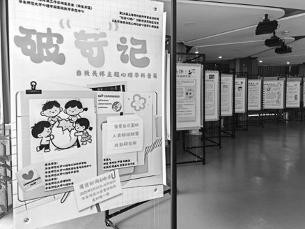 期末,两位授课老师联合学生骨干一同策展破“苛”记。此展目前正在华东师范大学普陀校区孟宪承·刘佛年教育成就陈列室展出。可以说,这既是一次课堂总结,又是一场兼具学术深度、实践温度与社会关怀的心理盛宴。它旨在构建一个自我关怀认知和行动清单的闭环,帮助破除个体内心自我苛责的枷锁,从而重塑健康且积极的自我认知。