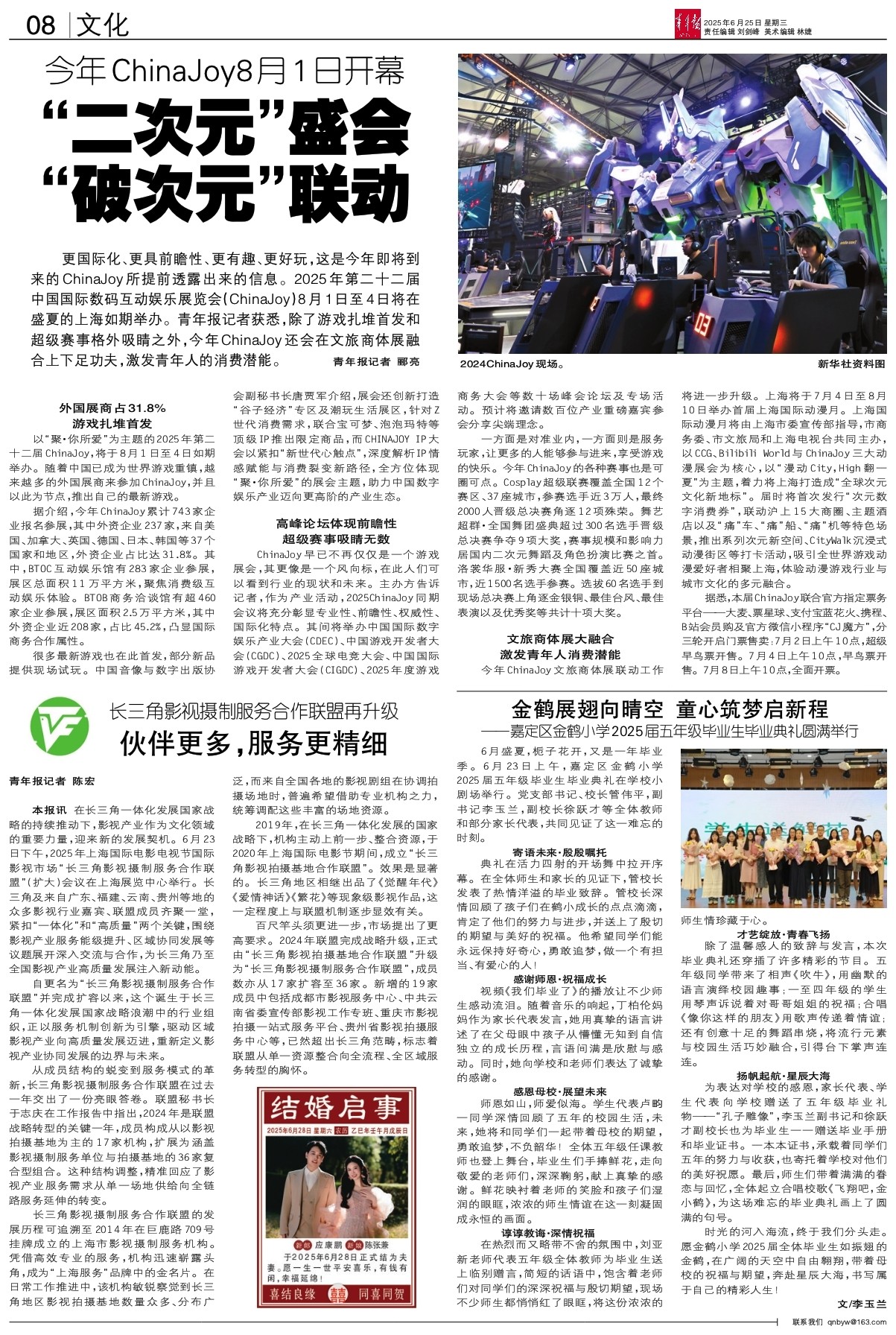 本报讯 在长三角一体化发展国家战略的持续推动下,影视产业作为文化领域的重要力量,迎来新的发展契机。6月23日下午,2025年上海国际电影电视节国际影视市场“长三角影视摄制服务合作联盟”(扩大)会议在上海展览中心举行。长三角及来自广东、福建、云南、贵州等地的众多影视行业嘉宾、联盟成员齐聚一堂,紧扣“一体化”和“高质量”两个关键,围绕影视产业服务能级提升、区域协同发展等议题展开深入交流与合作,为长三角乃至全国影视产业高质量发展注入新动能。