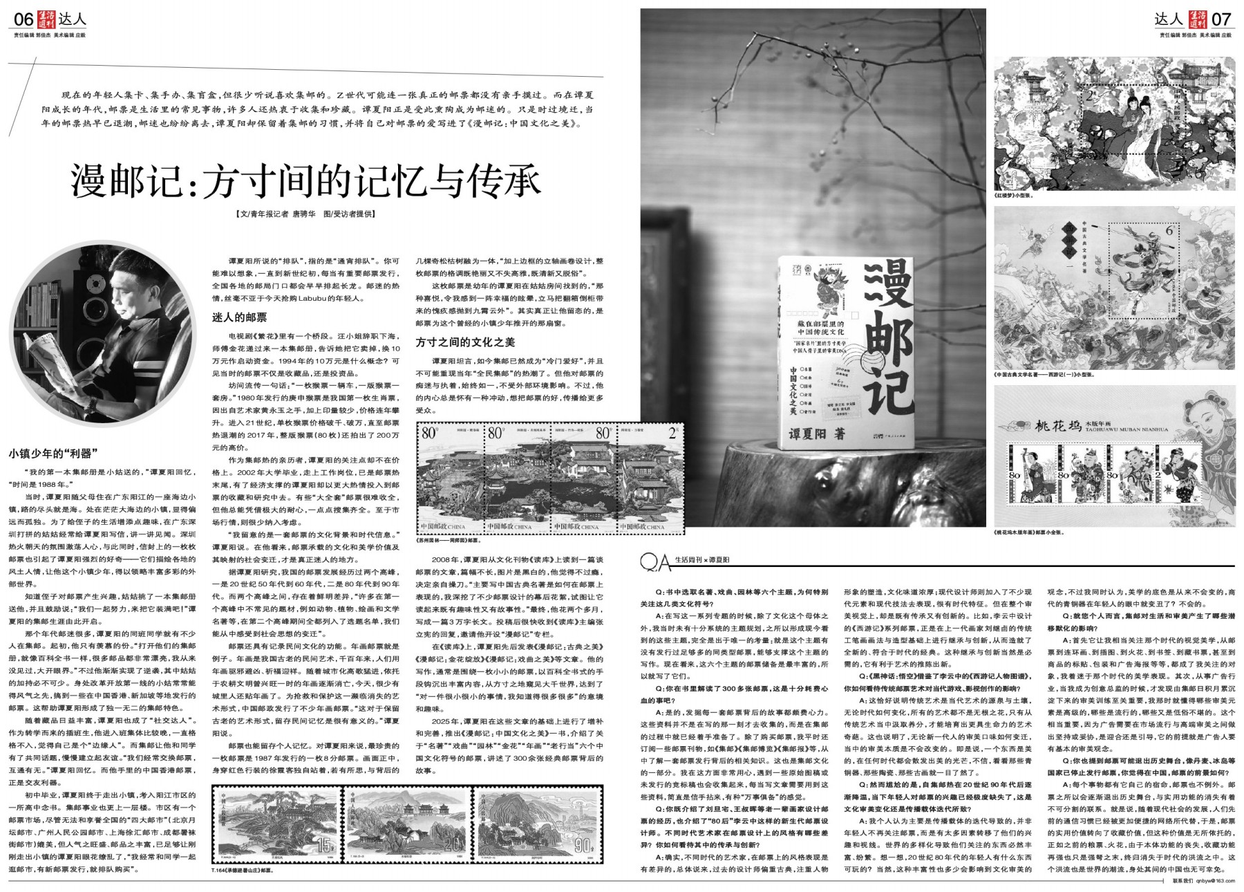 2025年,谭夏阳在这些文章的基础上进行了增补和完善,推出《漫邮记:中国文化之美》一书,介绍了关于“名著”“戏曲”“园林”“金花”“年画”“老行当”六个中国文化符号的邮票,讲述了300余张经典邮票背后的故事。