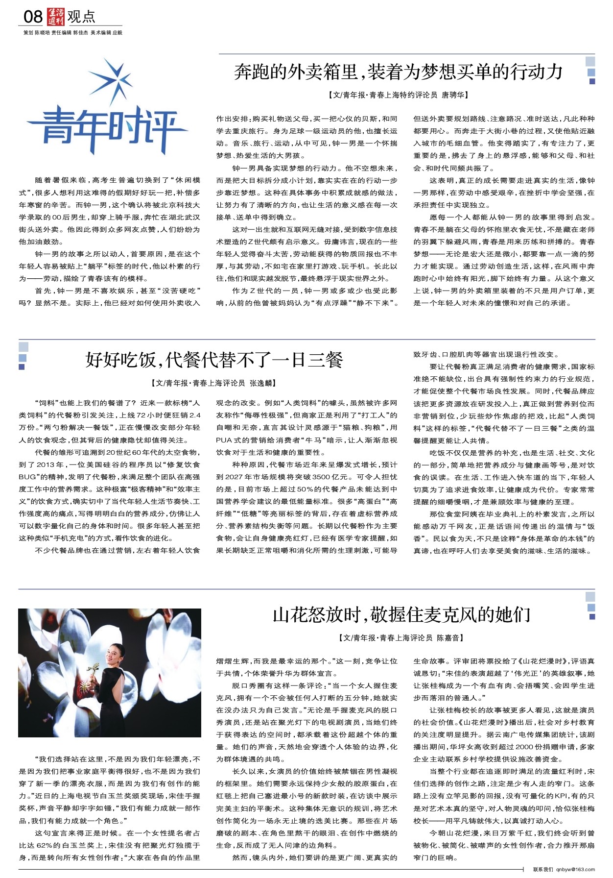 吃饭不仅仅是营养的补充,也是生活、社交、文化的一部分,简单地把营养成分与健康画等号,是对饮食的误读。在生活、工作进入快车道的当下,年轻人切莫为了追求进食效率,让健康成为代价。专家常常提醒的细嚼慢咽,才是兼顾效率与健康的至理。