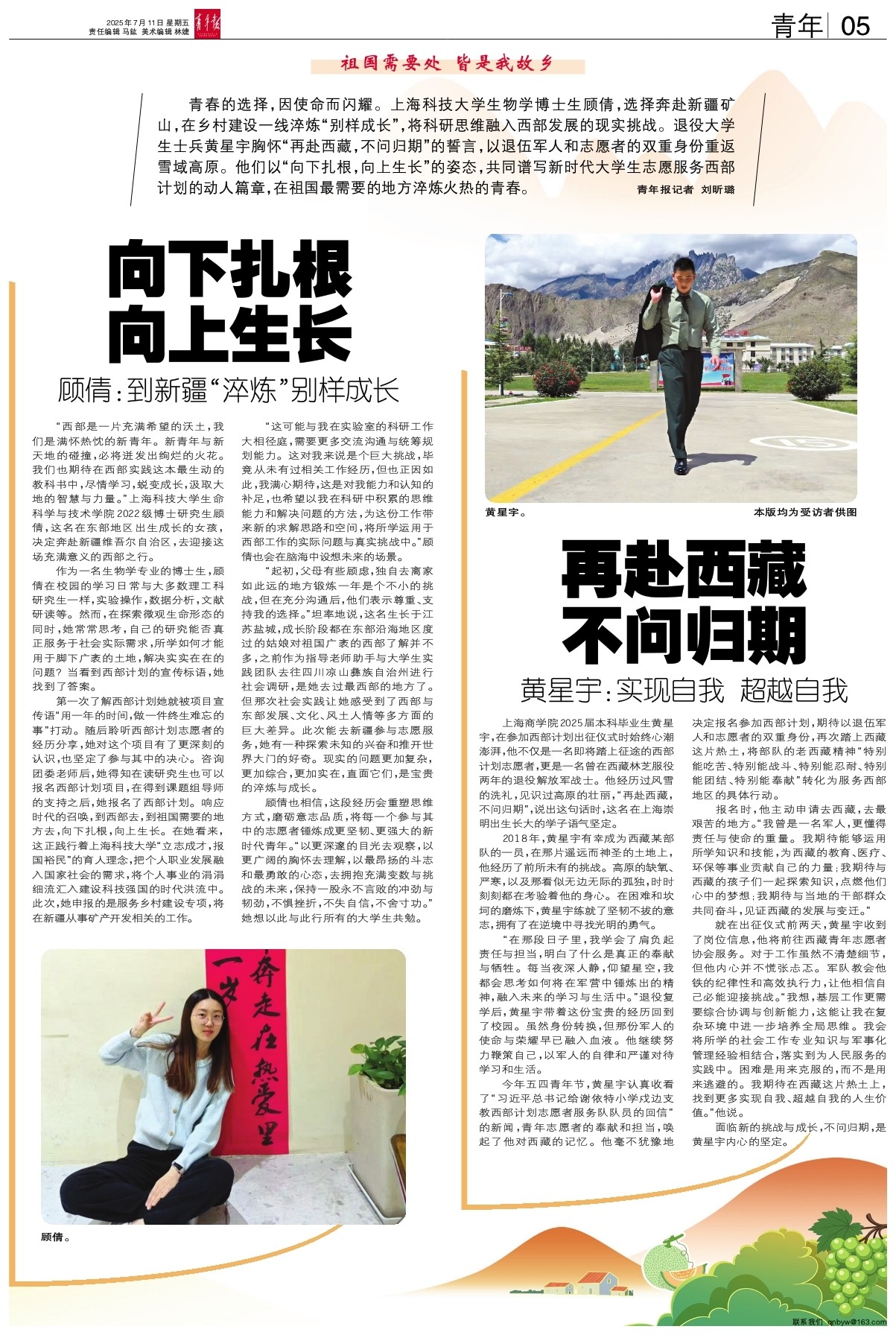 “这可能与我在实验室的科研工作大相径庭,需要更多交流沟通与统筹规划能力。这对我来说是个巨大挑战,毕竟从未有过相关工作经历,但也正因如此,我满心期待,这是对我能力和认知的补足,也希望以我在科研中积累的思维能力和解决问题的方法,为这份工作带来新的求解思路和空间,将所学运用于西部工作的实际问题与真实挑战中。”顾倩也会在脑海中设想未来的场景。