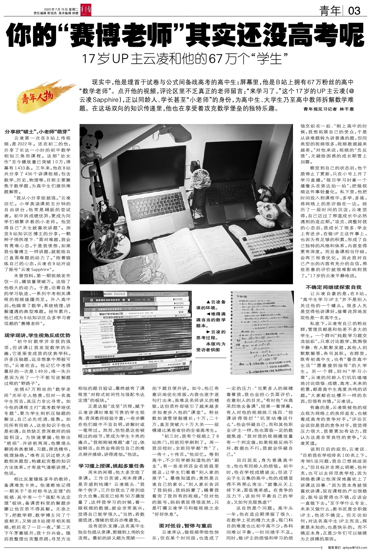 现实中,他是埋首于试卷与公式间备战高考的高中生;屏幕里,他是B站上拥有67万粉丝的高中“数学老师”。点开他的视频,评论区里不乏真正的老师留言:“来学习了。”这个17岁的UP主云凌(@云凌Sapphire),正以同龄人、学长甚至“小老师”的身份,为高中生、大学生乃至高中教师拆解数学难题。在这场双向的知识传递里,他也在享受着攻克数学堡垒的独特乐趣。
