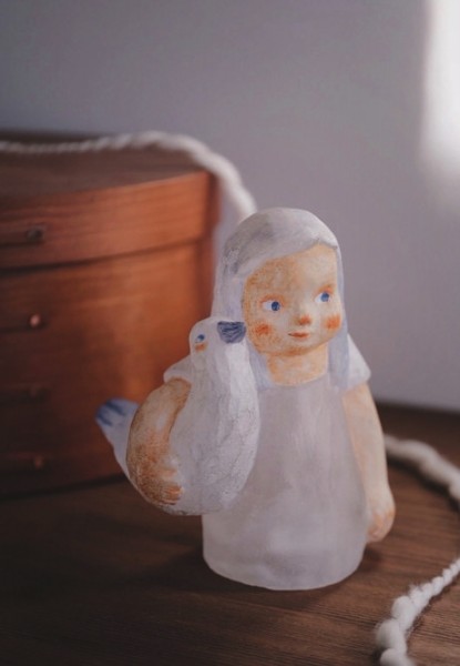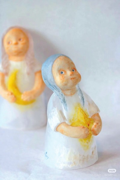 A:我的两个女儿啊!其实我的创作灵感,大多数来自我和女儿们的生活细节。你看这只小女孩抱着的鸽子,就是经常造访我家的那只,女儿可喜欢它了。这只兔子是养在大女儿学校里的。这个蒙面小精灵,是因为小女儿有次在逛街的时候看中一只玩偶,可是太贵了,我就说,妈妈给你做一个嘛。
