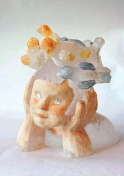 天真和童趣源自两个女儿。“我作品里的小女孩形象,原型大多是我女儿。”宁大侠说。比如,大女儿曾痴迷于学校的一只兔子,总念叨着“骑兔兔上学”。于是,一只驮着小女孩奋力奔跑的大白兔便在宁大侠手中诞生,算是用艺术形式帮女儿圆了梦。