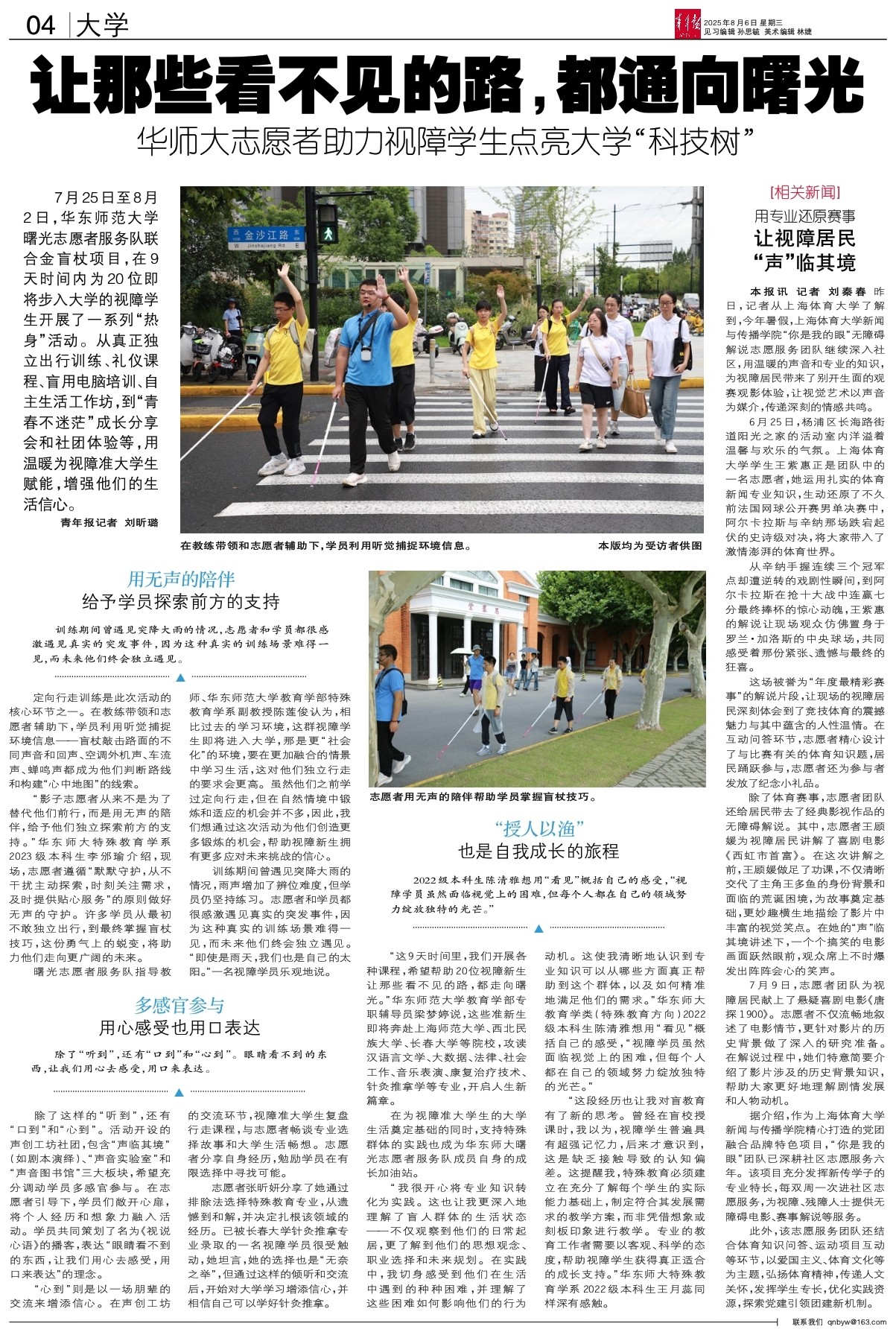 “这段经历也让我对盲教育有了新的思考。曾经在盲校授课时,我以为,视障学生普遍具有超强记忆力,后来才意识到,这是缺乏接触导致的认知偏差。这提醒我,特殊教育必须建立在充分了解每个学生的实际能力基础上,制定符合其发展需求的教学方案,而非凭借想象或刻板印象进行教学。专业的教育工作者需要以客观、科学的态度,帮助视障学生获得真正适合的成长支持。”华东师大特殊教育学系2022级本科生王月蕊同样深有感触。