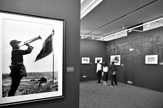 8月26日,“国社之镜·世纪光影之人民必胜”艺术展在北京开展。图为美国记者斯诺拍摄的名为抗战之声的照片。 新华社 图
