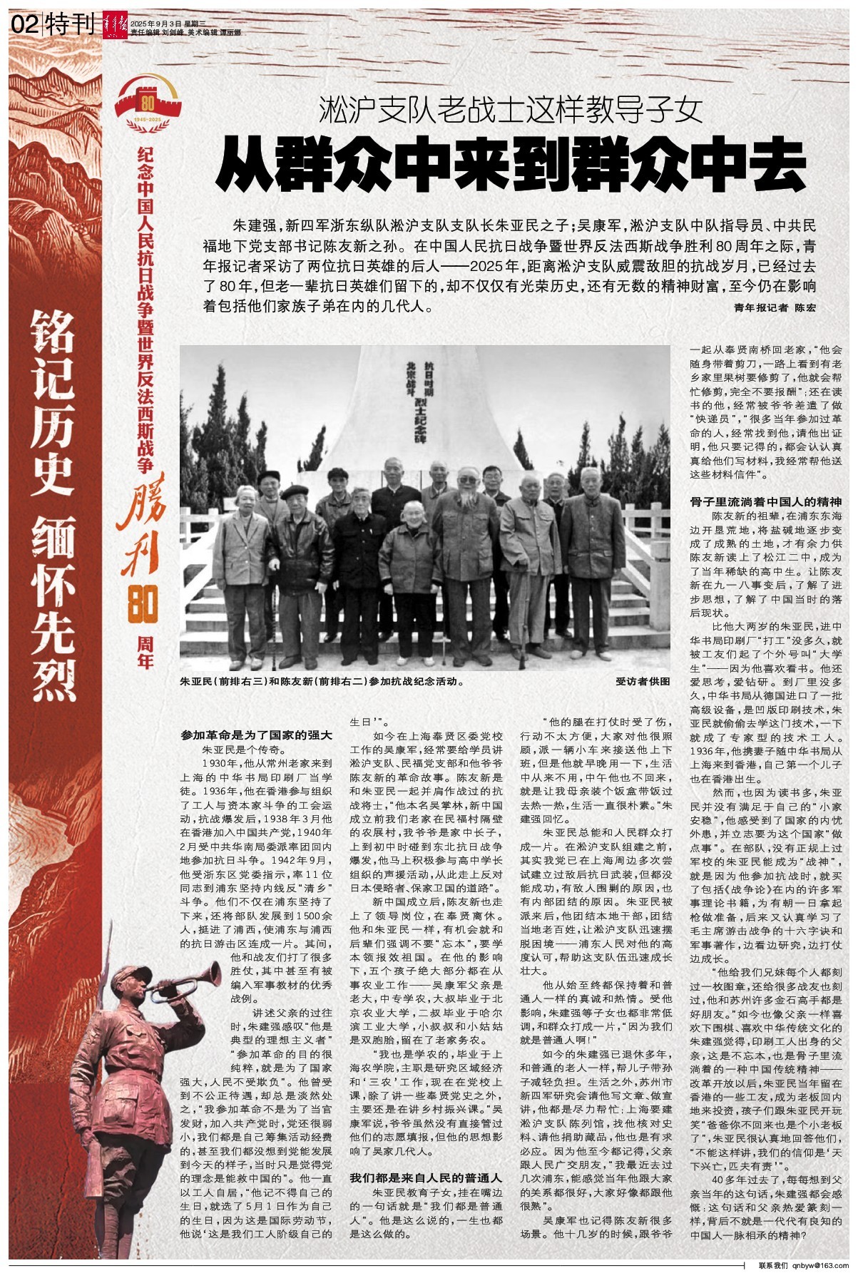 朱建强,新四军浙东纵队淞沪支队支队长朱亚民之子;吴康军,淞沪支队中队指导员、中共民福地下党支部书记陈友新之孙。在中国人民抗日战争暨世界反法西斯战争胜利80周年之际,青年报记者采访了两位抗日英雄的后人——2025年,距离淞沪支队威震敌胆的抗战岁月,已经过去了80年,但老一辈抗日英雄们留下的,却不仅仅有光荣历史,还有无数的精神财富,至今仍在影响着包括他们家族子弟在内的几代人。
