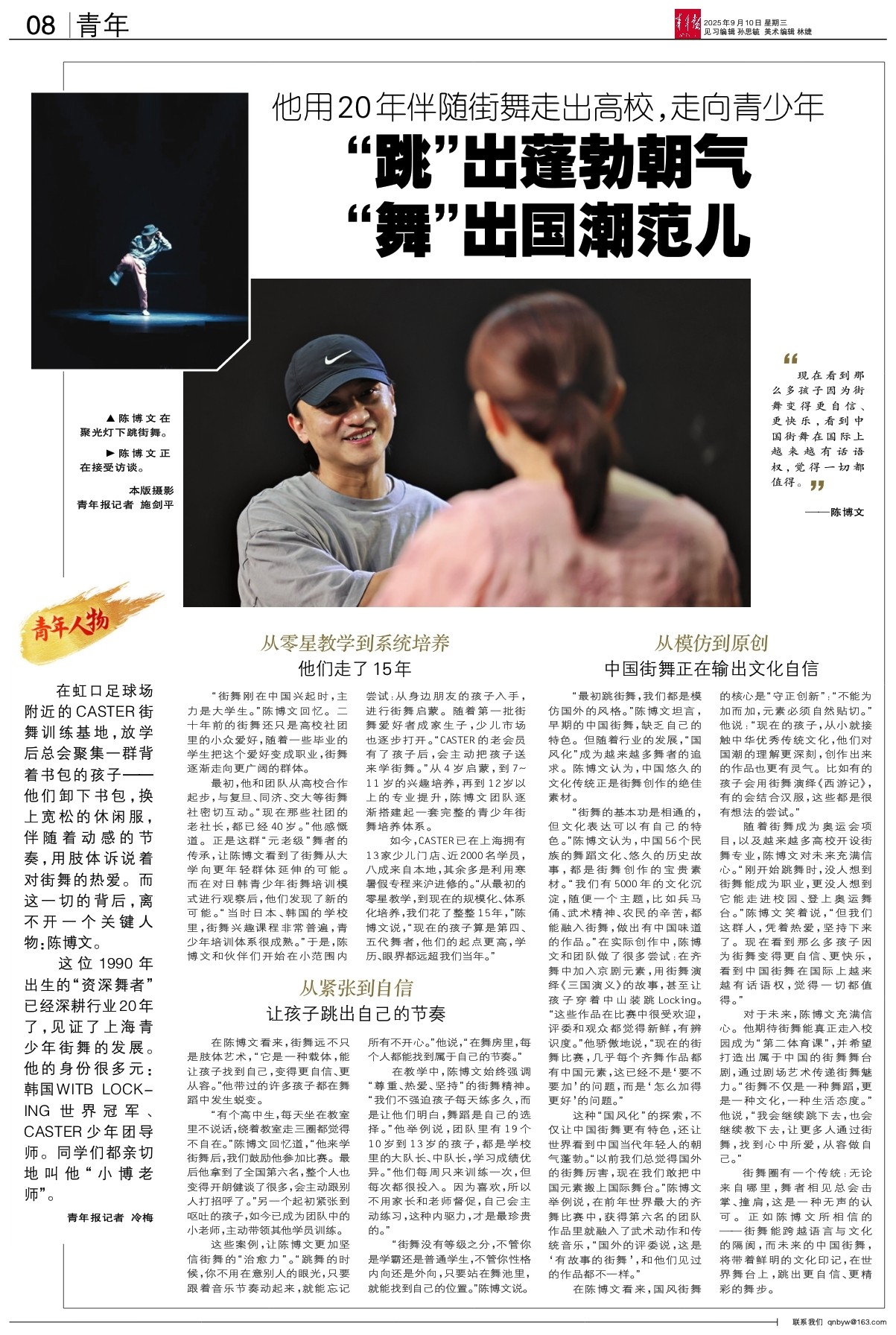 对于未来,陈博文充满信心。他期待街舞能真正走入校园成为“第二体育课”,并希望打造出属于中国的街舞舞台剧,通过剧场艺术传递街舞魅力。“街舞不仅是一种舞蹈,更是一种文化,一种生活态度。”他说,“我会继续跳下去,也会继续教下去,让更多人通过街舞,找到心中所爱,从容做自己。”