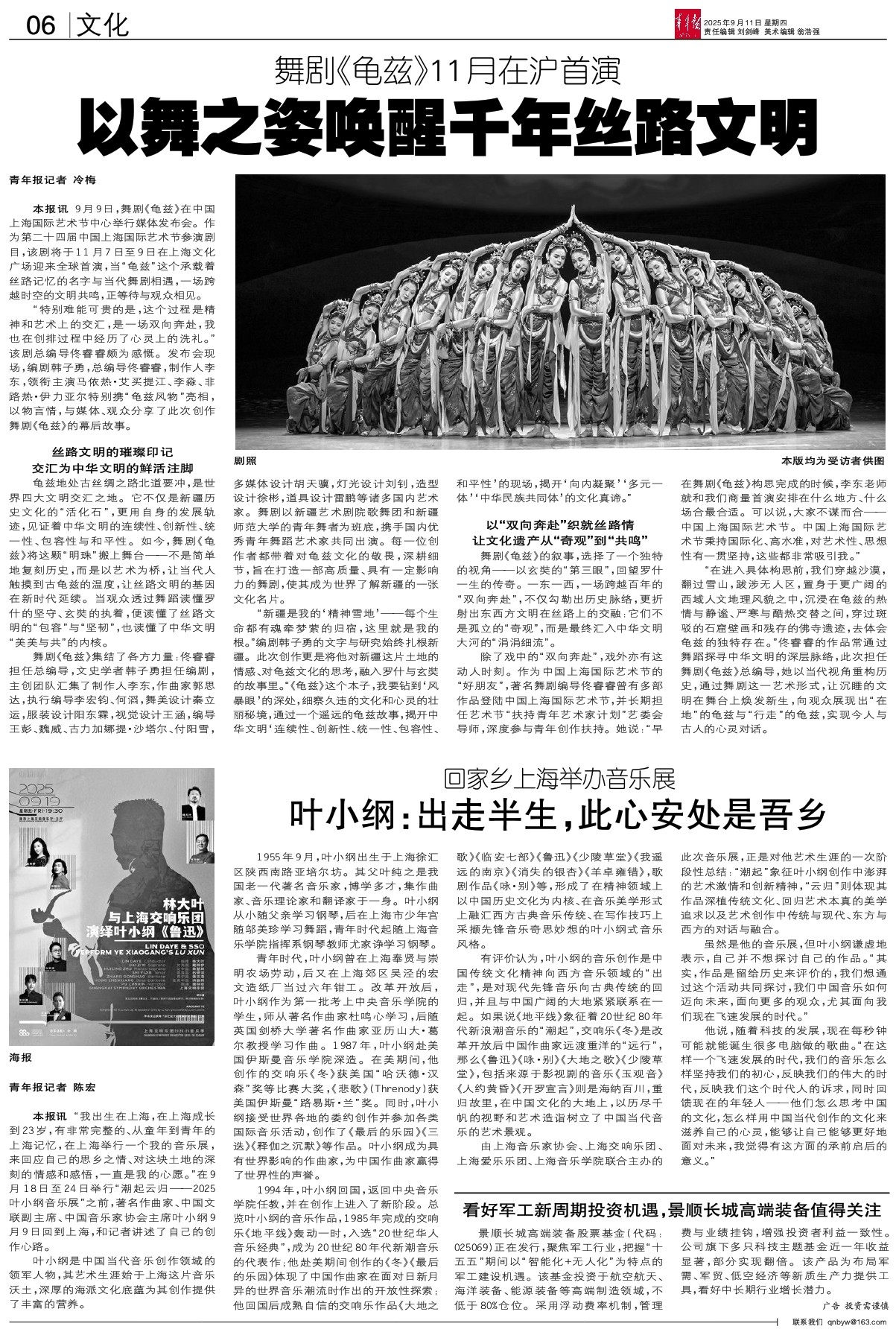 本报讯 9月9日,舞剧《龟兹》在中国上海国际艺术节中心举行媒体发布会。作为第二十四届中国上海国际艺术节参演剧目,该剧将于11月7日至9日在上海文化广场迎来全球首演,当“龟兹”这个承载着丝路记忆的名字与当代舞剧相遇,一场跨越时空的文明共鸣,正等待与观众相见。