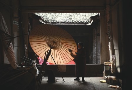 纸的形态和作用在历史上不断变化。图为制伞师在为油纸伞上桐油。