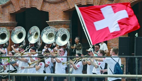 上海旅游节表演方队巡游首次来到虹口区滨港商业中心今潮8弄。图为瑞士吕斯苏格乐队在表演。青年报记者 施剑平 摄