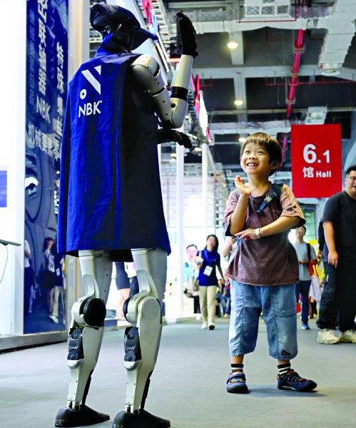 小朋友在展会现场与人形机器人互动。新华社 图