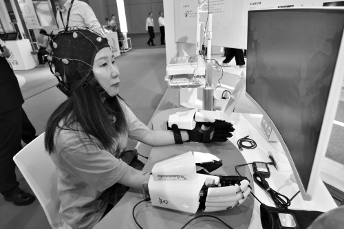 上海术理智能科技有限公司对这一“人工智能多模态脑机接口平台”拥有100%自主知识产权,公司副总裁靳辉告诉记者,演示中所用的正是该公司最新的非侵入式脑机接口医疗设备,“主要应用在医疗上,可以帮助中风后偏瘫的患者做神经康复”。据他介绍,这款设备已成功支持了中国首个脑机接口病房在北京天坛医院的落地建设,并已帮助超过1000名患者完成了无创的神经康复治疗。