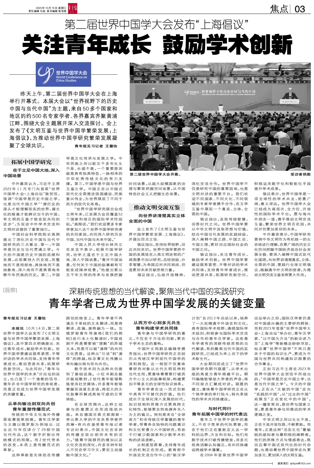 本报讯 10月14日,第二届世界中国学大会发布了《文明互鉴与世界中国学繁荣发展:上海倡议》,其中第四点明确提出:关注青年成长,鼓励学术创新。世界中国学要建设联系紧密、平等对话的学术共同体,支持青年学者成长,推动资源共享,拓展研究新空间。与此同时,“青年与世界中国学的未来”分论坛的设立,也凸显了一个清晰的信号:青年并非中国学研究的旁观者,而是正在成为世界中国学发展的关键变量。