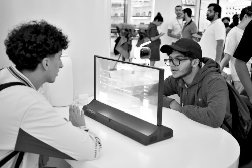 10月14日,两名外籍客商在义乌全球数贸中心体验AI翻译互动屏。新华社 图