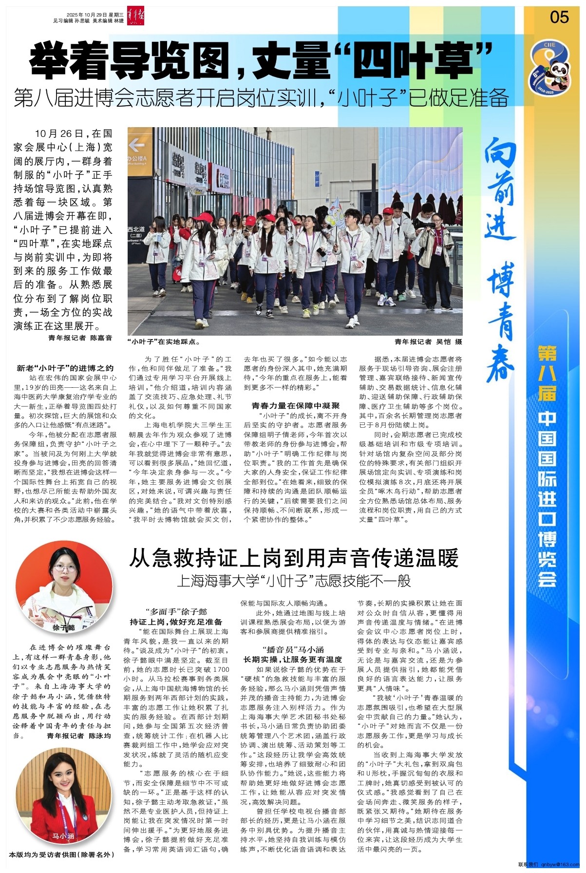 曾担任学校电视台播音部部长的经历,更是让马小涵在服务中别具优势。为提升播音主持水平,她坚持自我训练与模仿练声,不断优化语音语调和表达节奏,长期的实操积累让她在面对公众时自信从容,更懂得用声音传递温度与情绪。“在进博会会议中心志愿者岗位上时,得体的表达与仪态能让嘉宾感受到专业与亲和。”马小涵说,无论是与嘉宾交流,还是为参展人员提供指引,她都能凭借良好的语言表达能力,让服务更具“人情味”。