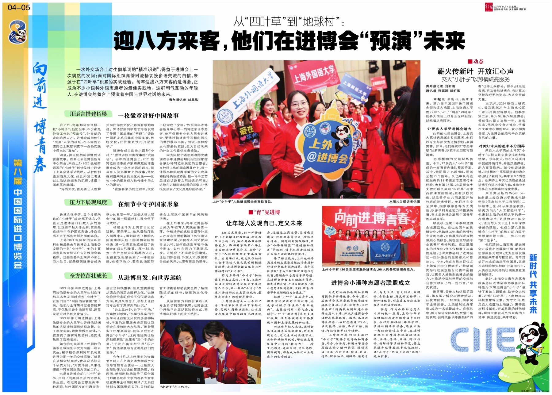 本报讯 新时代,共享未来。第八届中国国际进口博览会即将盛大启幕,上海交通大学的77名“小叶子”将在“四叶草”的各大岗位上以专业诠释担当,以热情点亮服务。
