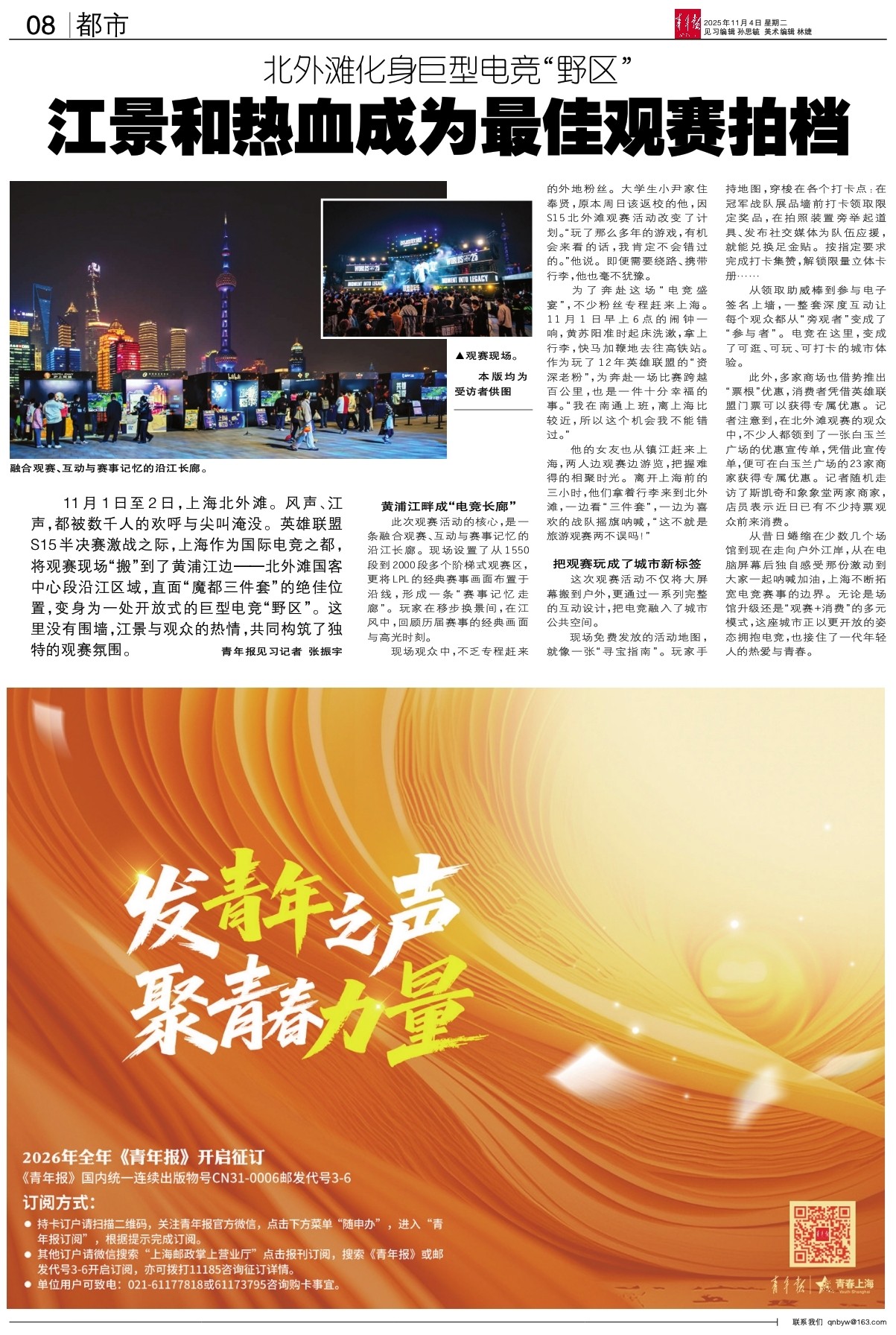 从昔日蜷缩在少数几个场馆到现在走向户外江岸,从在电脑屏幕后独自感受那份激动到大家一起呐喊加油,上海不断拓宽电竞赛事的边界。无论是场馆升级还是“观赛+消费”的多元模式,这座城市正以更开放的姿态拥抱电竞,也接住了一代年轻人的热爱与青春。