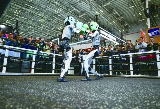 在第八届进博会宇树科技展台,人形机器人进行格斗表演。新华社 图